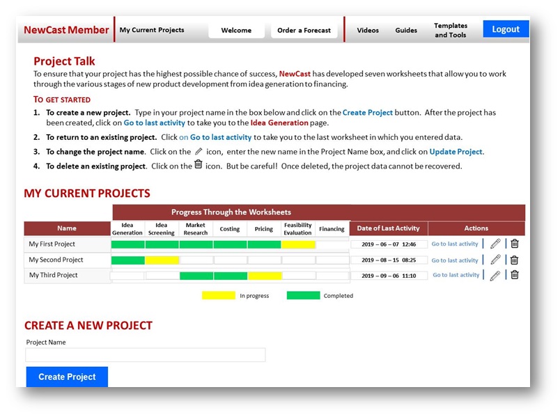 A project is your idea for a new product or service. The portal is organized to allow you to work through the various stages of new product development, from idea generation to financing.